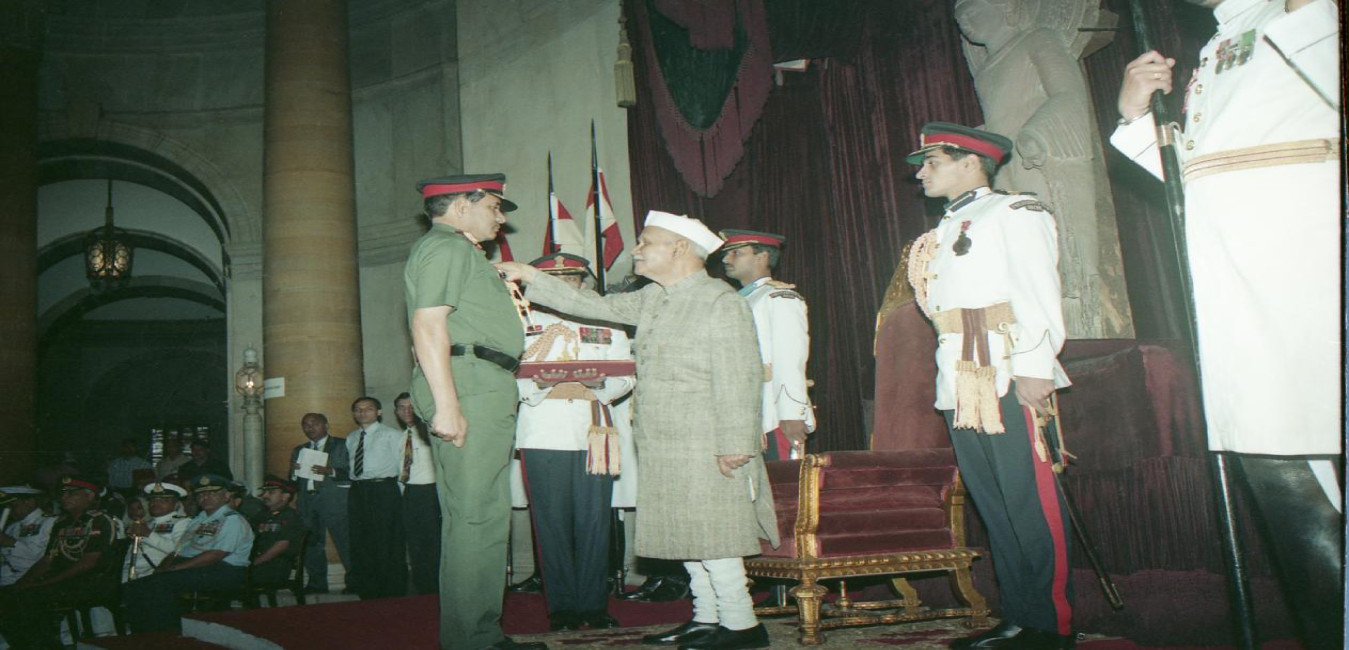 The President of India, Dr. Shankar Dayal Sharma presenting Gallantry awards to Armed Forces Personnel, at the Defence Investiture Ceremony-I at Rashtrapati Bhavan in New Delhi on April 15, 1997.