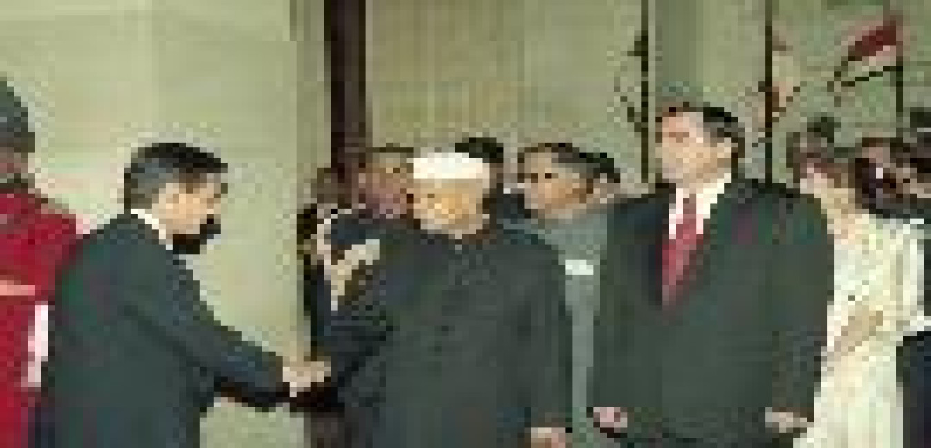 The President of India, Dr. Shankar Dayal Sharma receiving H.E. Mr. Emomali Sharipovich Rakhmonov, President of the Republic of Tajikistan, at the Ceremonial Reception, at Rashtrapati Bhavan in New Delhi on December 11, 1995.