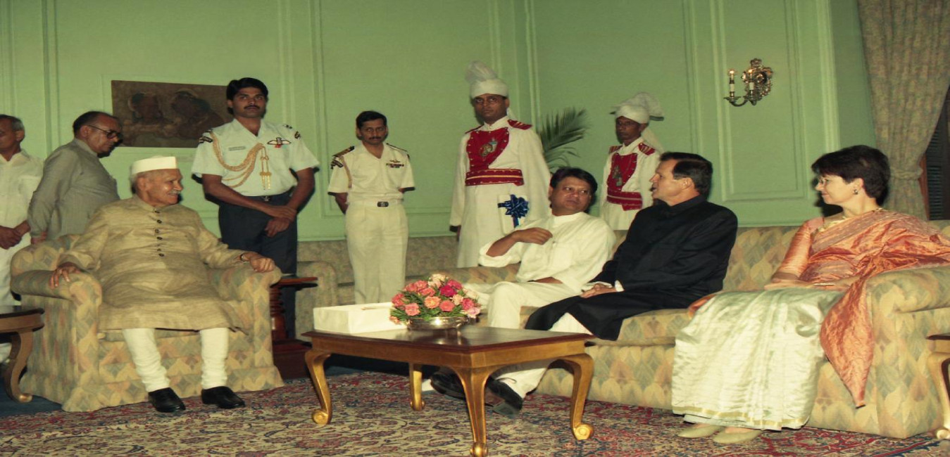 The President of India, Dr. Shankar Dayal Sharma meeting with Smt. Vijaya Raje Sindhia with others at Rashtrapati Bhavan in New Delhi on August 26, 1995.