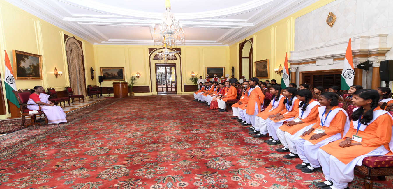The President of India Smt Droupadi Murmu Meeting 30 students and 6 management staff of Maa Sharda Kanya Vidyapith Village Pondki District Anuppur Madhya Pradesh at Rashtrapati Bhavan on April 9, 2024.