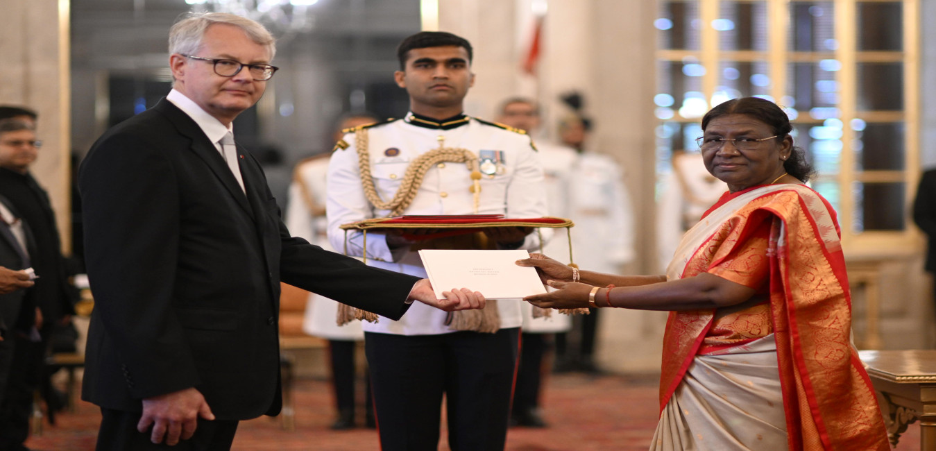 The Ambassador-designate of the Republic of Finland, H.E.Mr.Kimmo Lahdevirta presenting his credentials to the President of India Smt. Droupadi Murmu at Rashtrapati Bhavan on July 19, 2023.