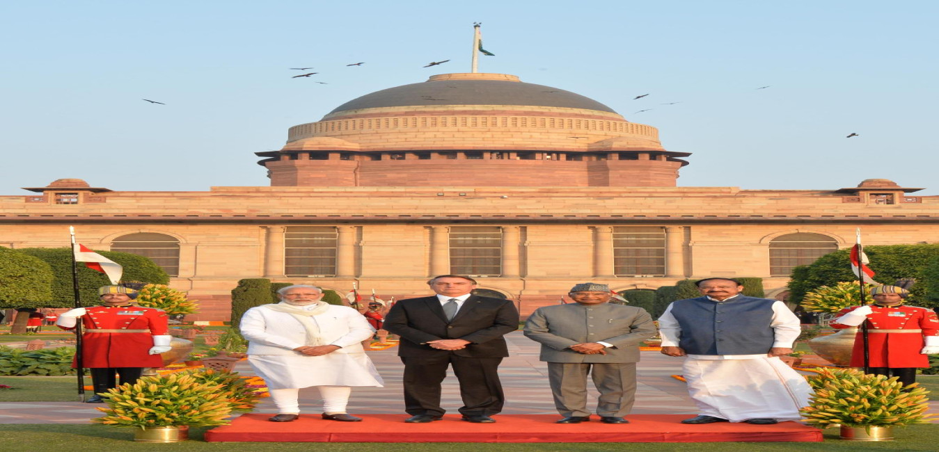 The President of India, Shri Ram Nath Kovind accords a ceremonial welcome to the President of the Federative Republic of Brazil, H.E. Mr. Jair Bolsonaro, at Rashtrapati Bhavan on January 25, 2020.
