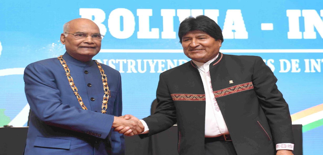 The President of India, Shri Ram Nath Kovind receives by the President of Plurinational State of Bolivia, H.E Mr. Evo Morales, at Hotel Camino Real, Santa Cruz, in Bolivia on March 29, 2019.