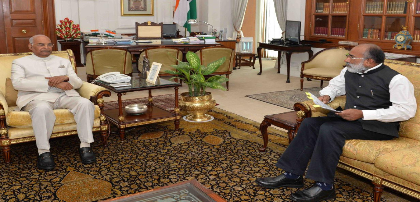 Shri Ramachandru Tejavath, Special Representative Govt. of Telanagana along with Shri Amgoth Tukaram, Mountaineer meeting with the President of India, Shri Ram Nath Kovind, at Rashtrapati Bhavan on July 18, 2018.