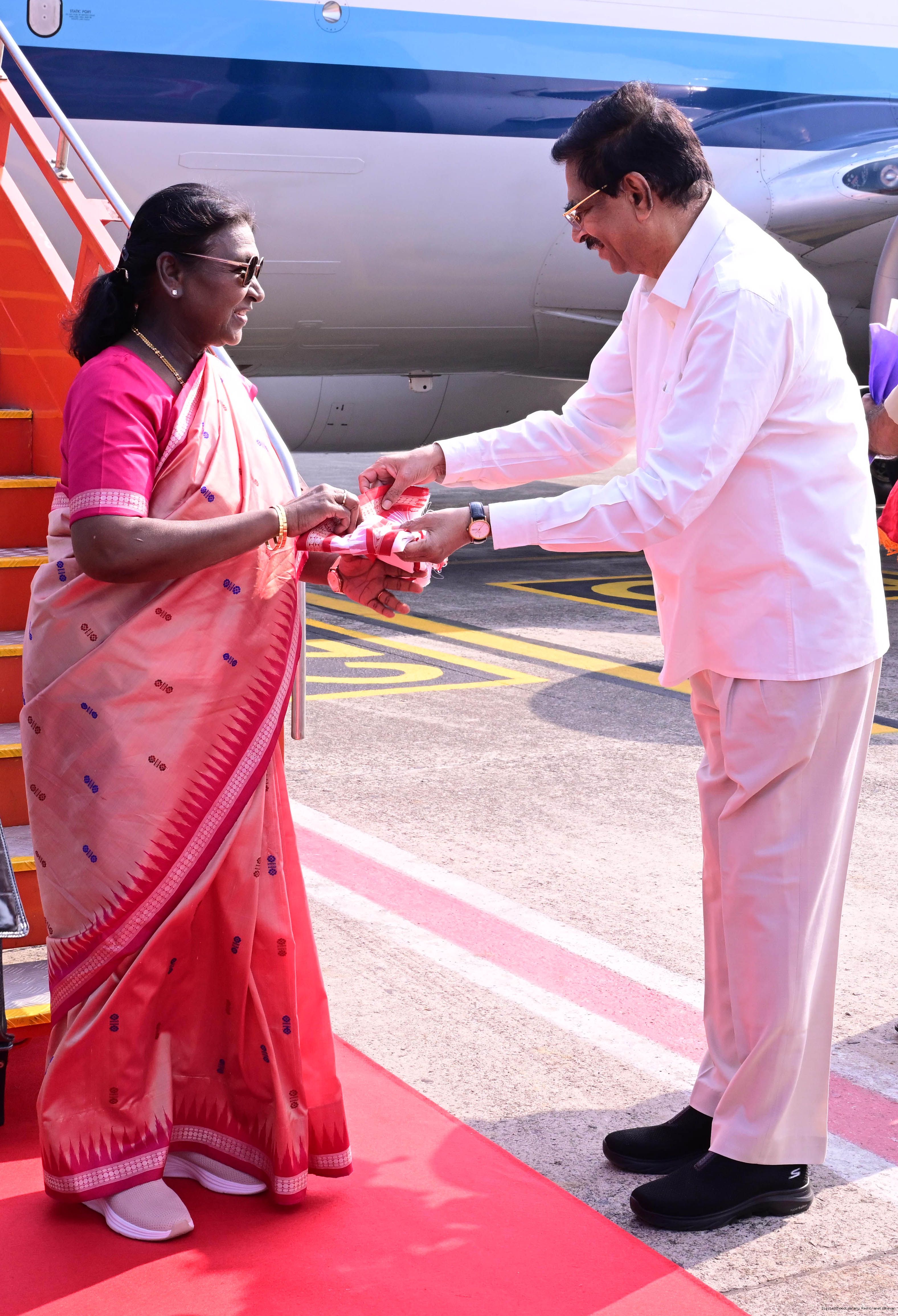 The Governor of Odisha, Dr Hari Babu Kambhampati, Chief Minister, Shri Mohan Charan Majhi, Union Education Minister, Shri Dharmendra Pradhan and Union Minister for Tribal Affairs, Shri Jual Oram received the President of India, Smt. Droupadi Murmu on her arrival in Bhubaneswar, Odisha on November 27, 2025.