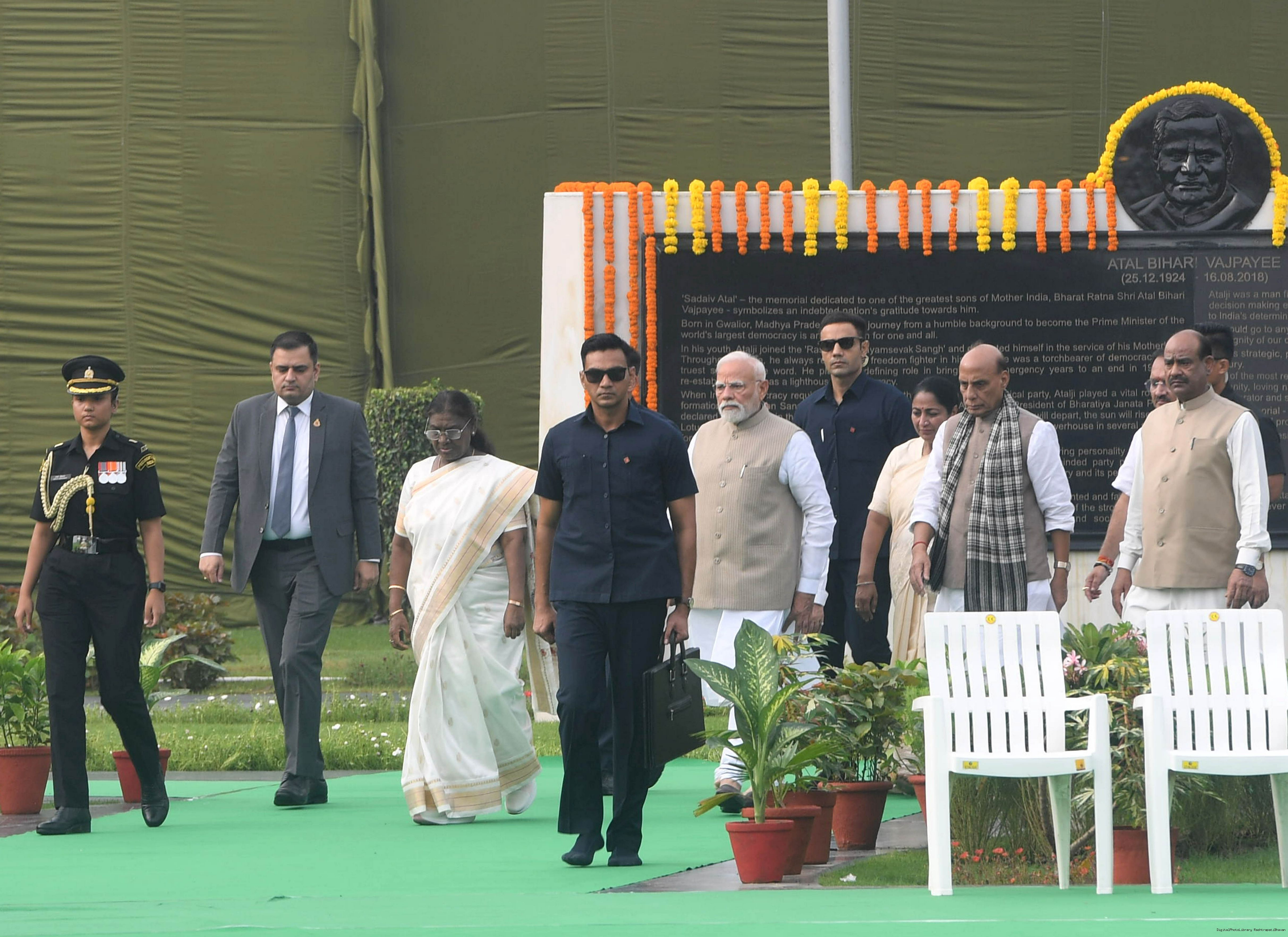 The President of India, Smt Droupadi Murmu paid homage to former Prime Minister of India, Shri Atal Bihari Vajpayee on his death anniversary at his Samadhi 'Sadaiv Atal' in New Delhi on August 16, 2025.