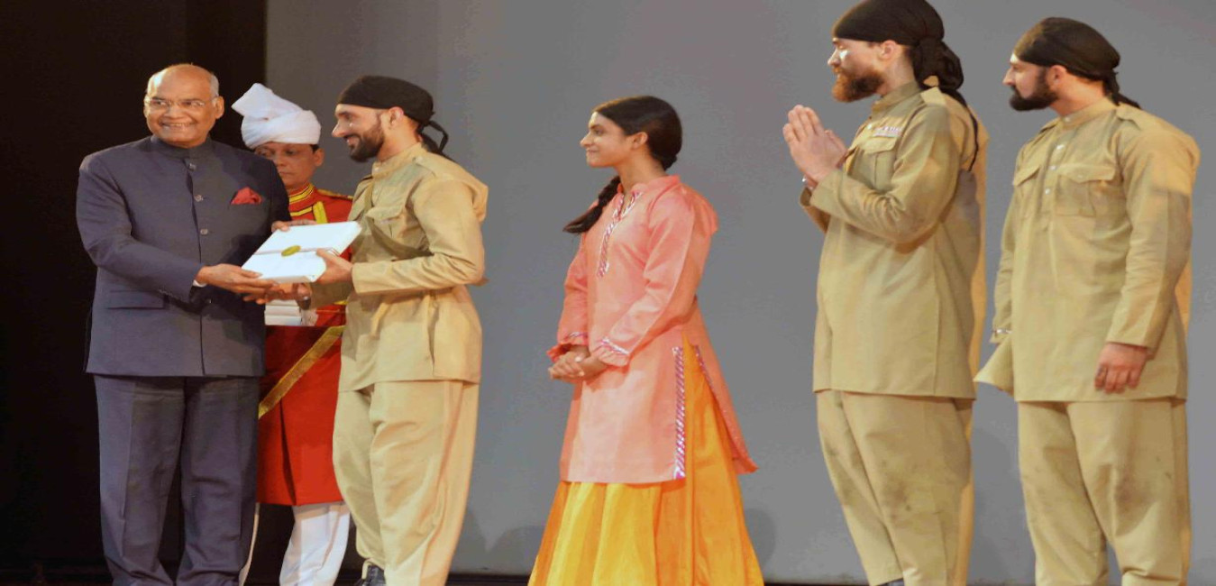 The President of India, Shri Ram Nath Kovind felicitating the artistes after witnessing the play 'Usne Kaha Tha' (The Torth), at Rashtrapati Bhavan Auditorium on February 13, 2018.