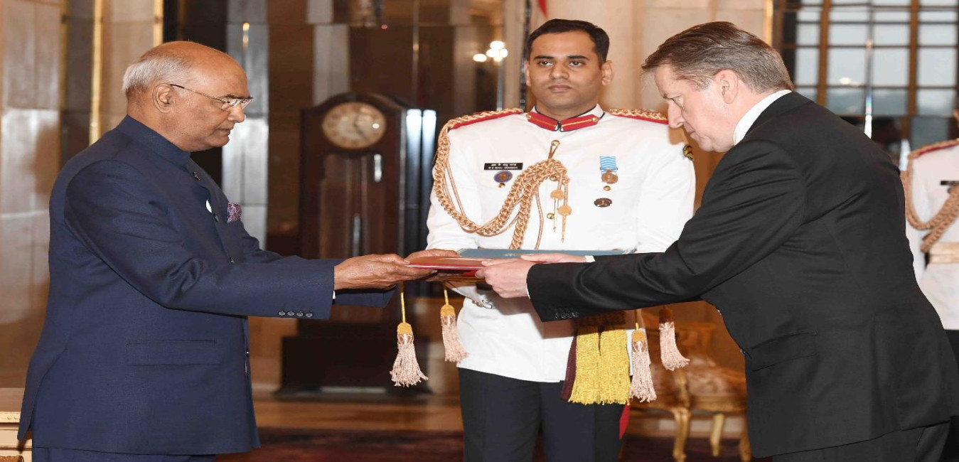 The Ambassador-designate of the Russian Federation, HE Mr. Nikolay Rishatovich Kudashev presenting his credentials to the President of India, Shri Ram Nath Kovind, at Rashtrapati Bhavan on October 26, 2017.