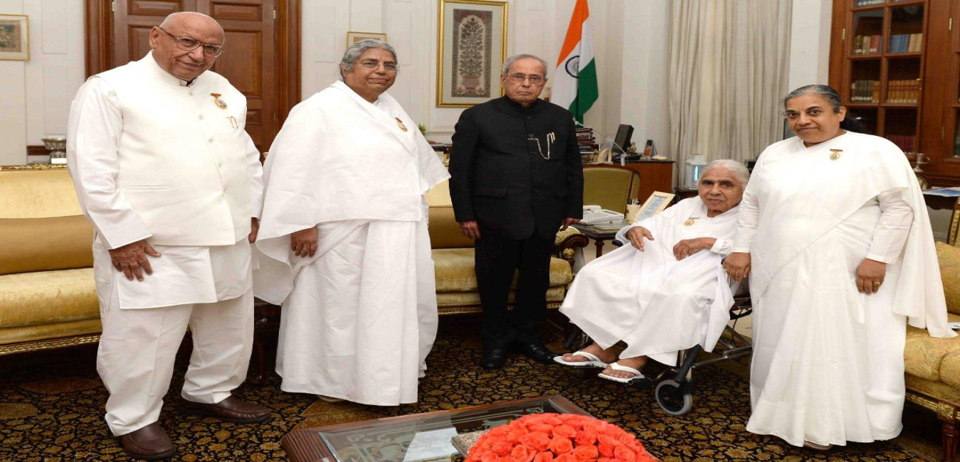 The President of India, Shri Pranab Mukherjee meeting with Dadi Janki, Chief of Brahma Kumaris alongwith BK Brijmohan, BK Asha and BK Hansa from Prajapita Brahma Kumaris Ishwariya Vishwa Vidyalaya, at Rashtrapati Bhavan on June 20, 2017.