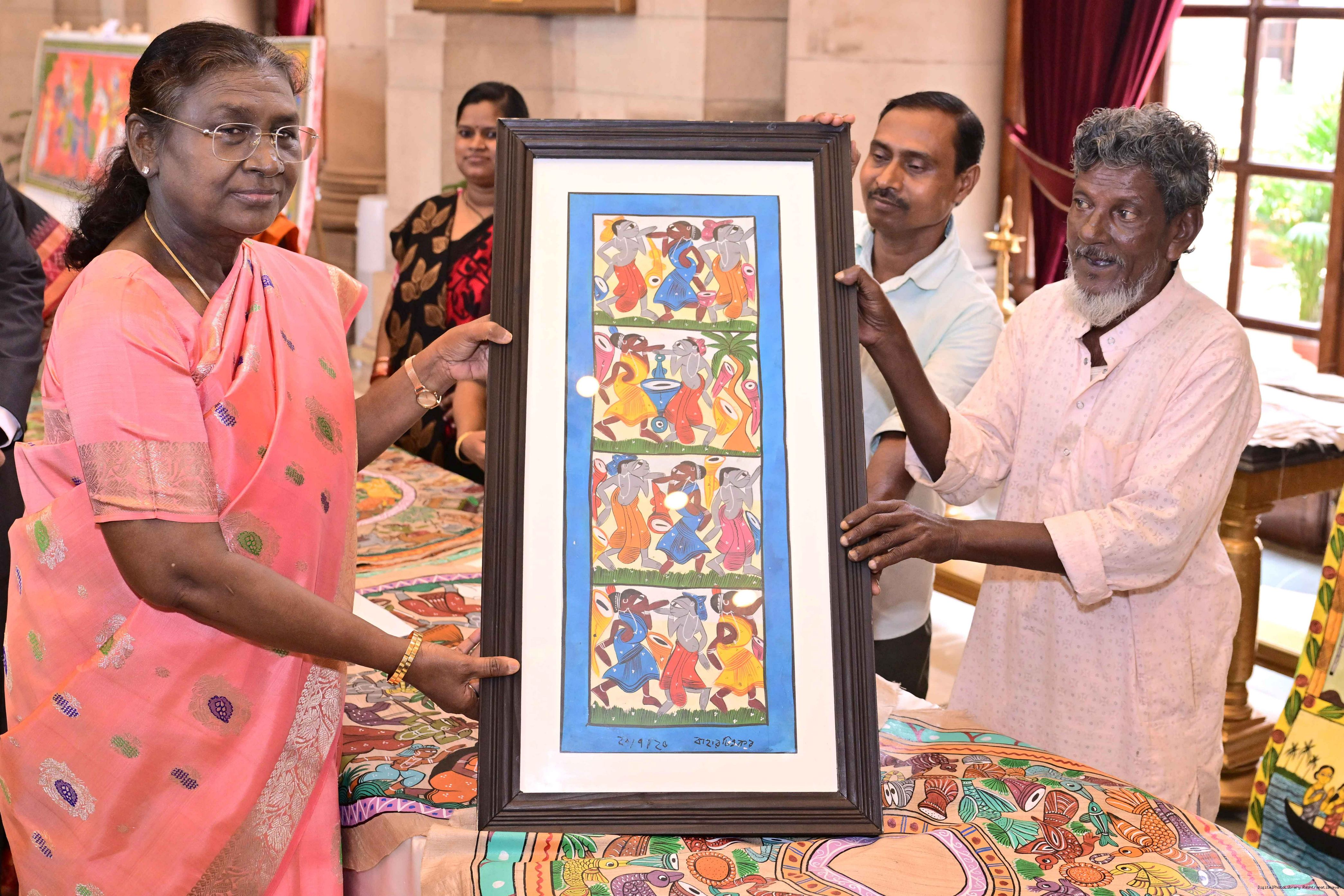 A group of Artists of Sohrai, Pattachitra and Patua art forms called on the President of India, Smt. Droupadi Murmu at Rashtrapati Bhavan on July 24, 2025.
