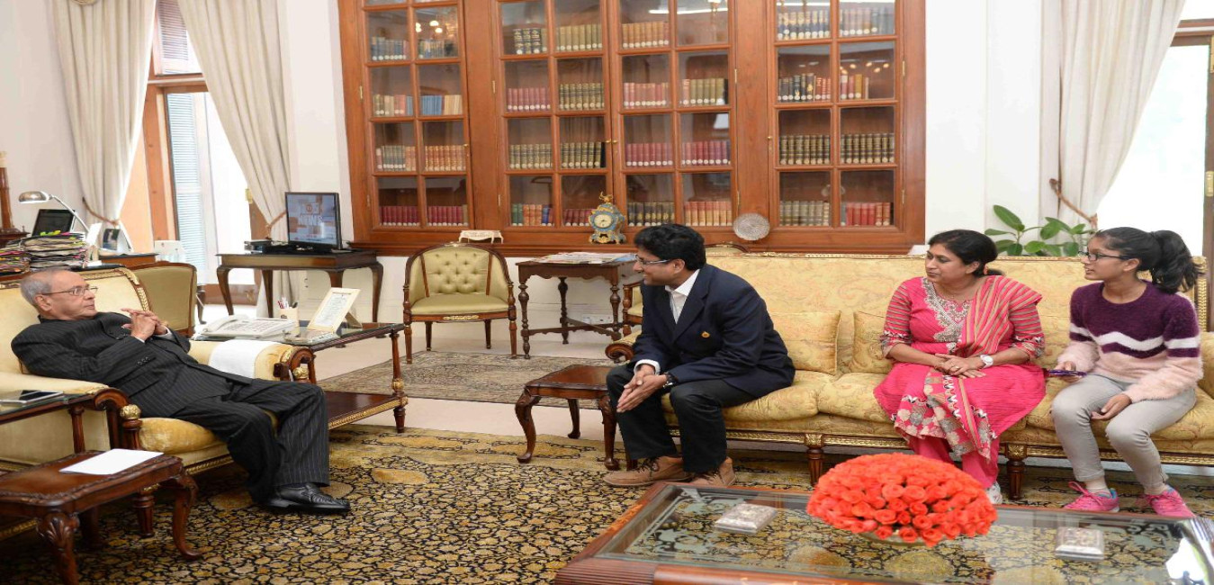The President of India, Shri Pranab Mukherjee meeting with Smt. & Shri Uday Sankar Majumdar, General Manager, Syndicate Bank alongwith their daughter, at Rashtrapati Bhavan on December 19, 2016.