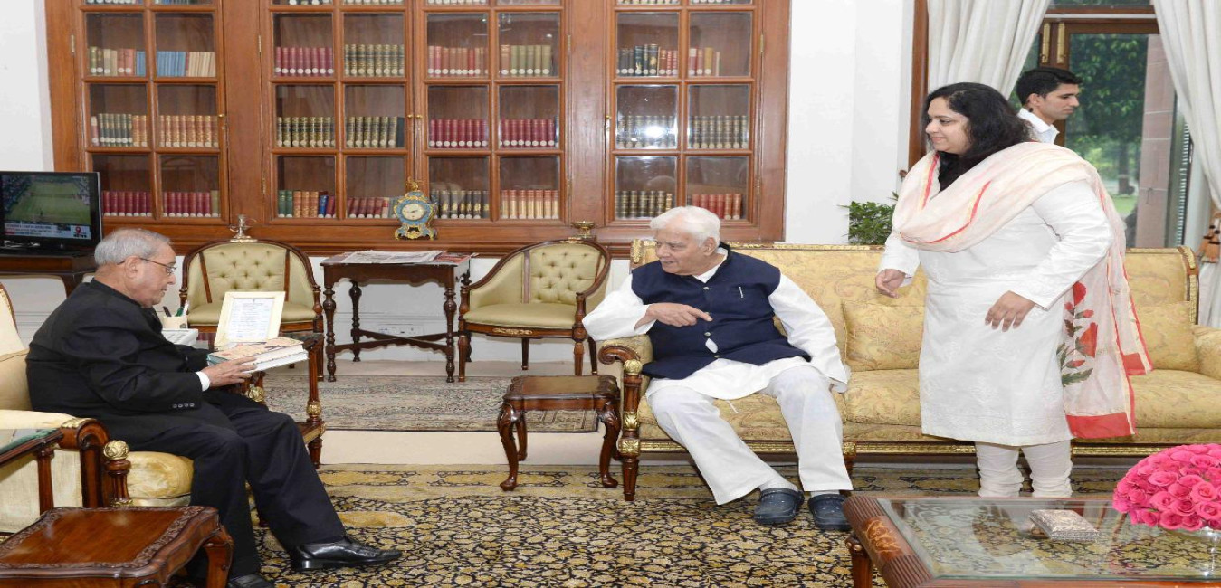 The President of India, Shri Pranab Mukherjee meeting with Shri A.K. Chakrabortty and Dr. Vijay Prankar, at Rashtrapati Bhavan on June 22, 2017.