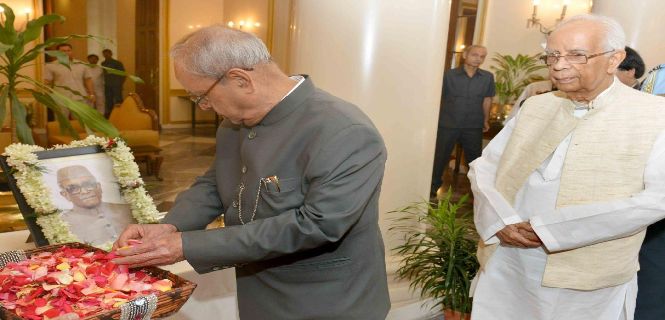 The President of India, Shri Pranab Mukherjee and the Governor of West Bengal, Shri Keshari Nath Tripathi paying floral tributes, at the portrait of Shri Neelam Sanjiva Reddy, former President of India, on his Birth Anniversary, at Kolkata, in West Bengal on May 19, 2017.