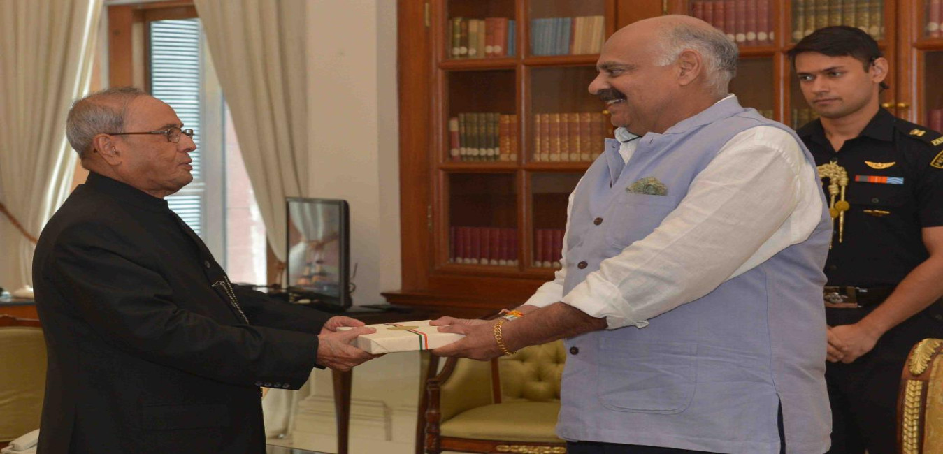 The President of India, Shri Pranab Mukherjee meeting with Shri V.P. Singh Badnore, Governor-designate of Punjab, at Rashtrapati Bhavan on August 20, 2016.