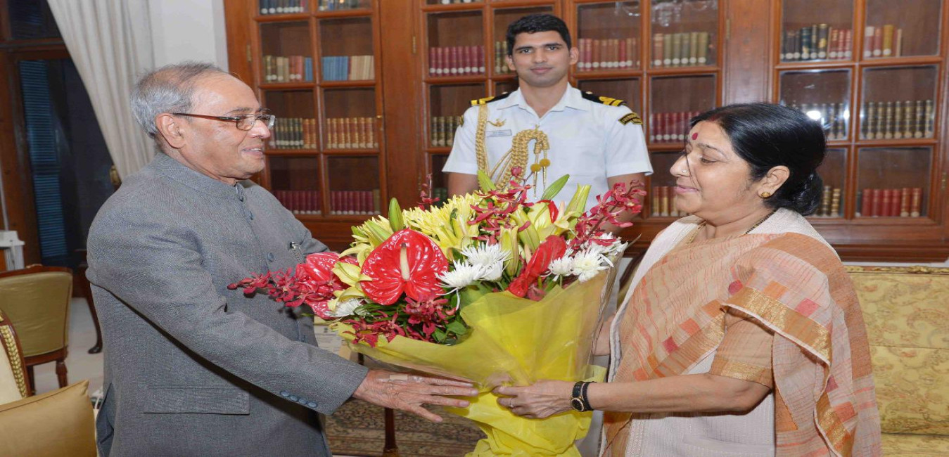 The President of India, Shri Pranab Mukherjee meeting with Smt. Sushma Swaraj, Minister of External Affairs, at Rashtrapati Bhavan on August 02, 2016.