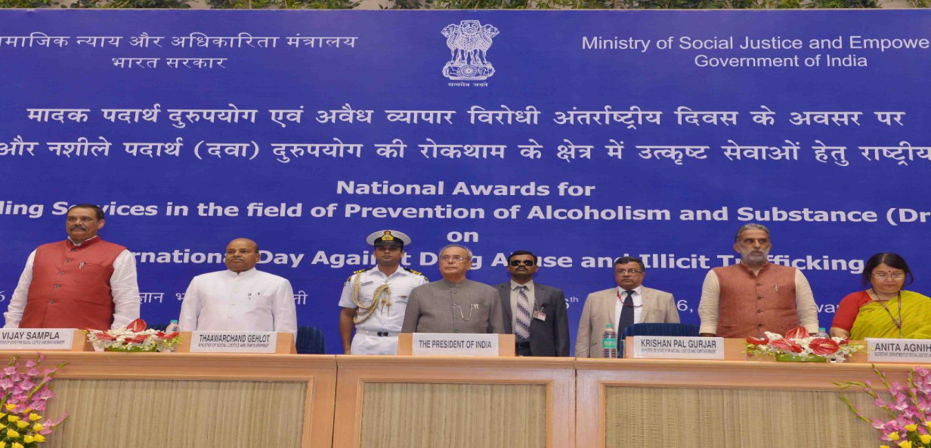 The President of India, Shri Pranab Mukherjee presenting the National Awards for Outstanding Services in the field of Prevention of Alcoholism and Substance (Drugs) Abuse, on the occasion of International Day against Drug Abuse and Illicit Trafficking, in New Delhi on June 26, 2016.