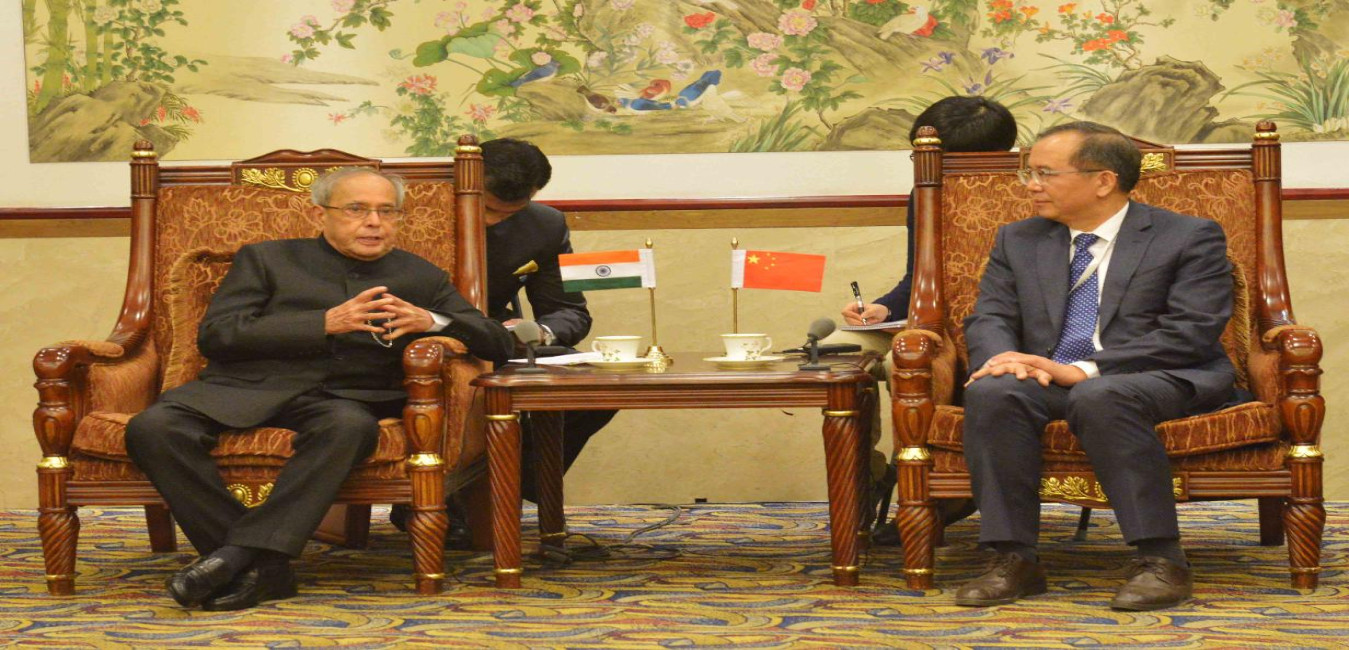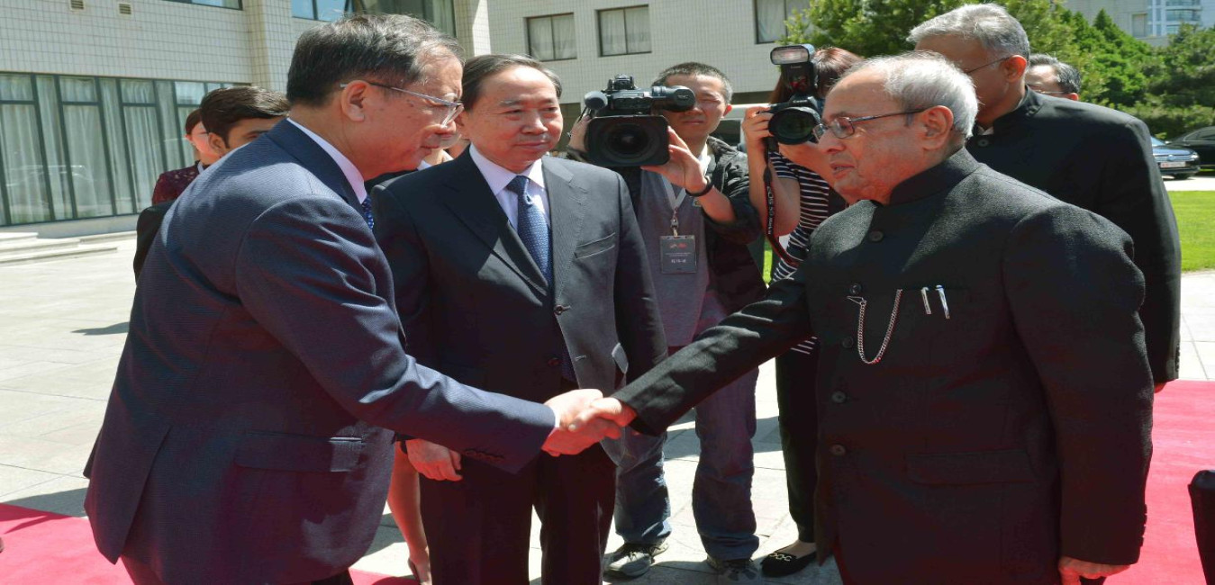 The State Councilor of the People's Republic of China, Mr. Yang Jiechi calling on the President of India, Shri Pranab Mukherjee, at Hotel St Regis, in Beijing, The People s Republic of China on May 27, 2016.