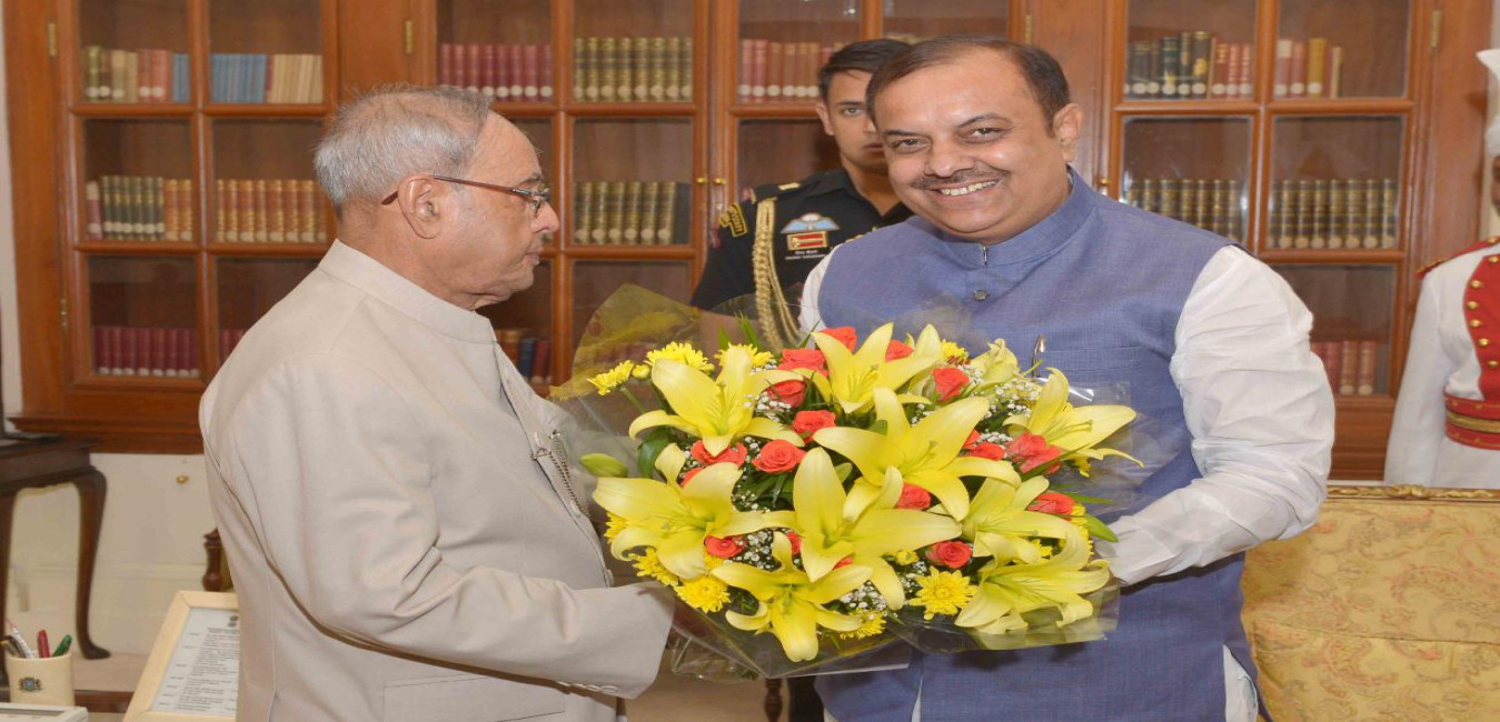 The President of India, Shri Pranab Mukherjee meeting with Shri Sukhbir Sharma, Vice President, Delhi Pradesh Congress Committee and Shri Praveen Aggarwal, at Rashtrapati Bhavan on May 30, 2016.