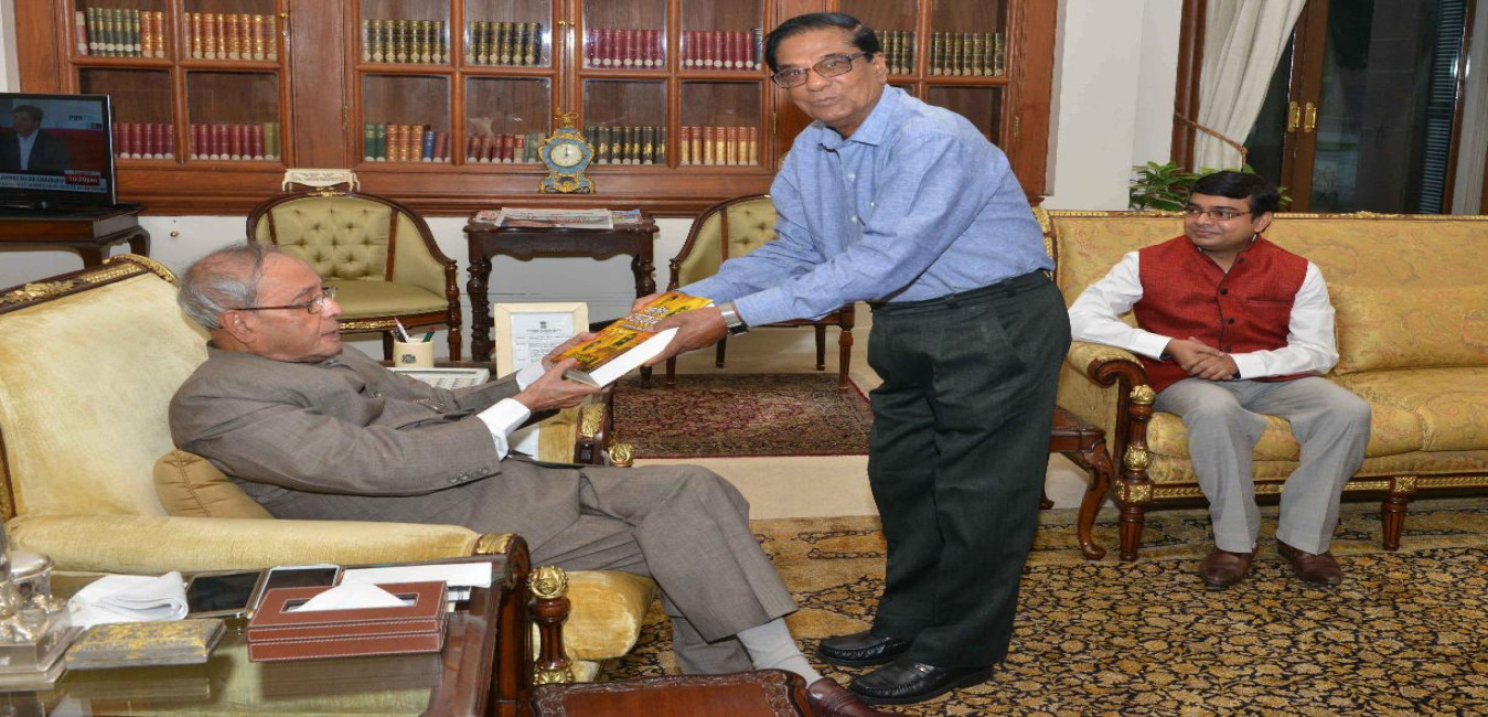 The President of India, Shri Pranab Mukherjee receiving a book ''Antardrishti te Satyao ke Dekha-Ek Sampadak-er Jibon Charchya'' from Shri Upen Chakraborty and Shri D. Mondal from Kolkata, at Rashtrapati Bhavan on May 20, 2016.