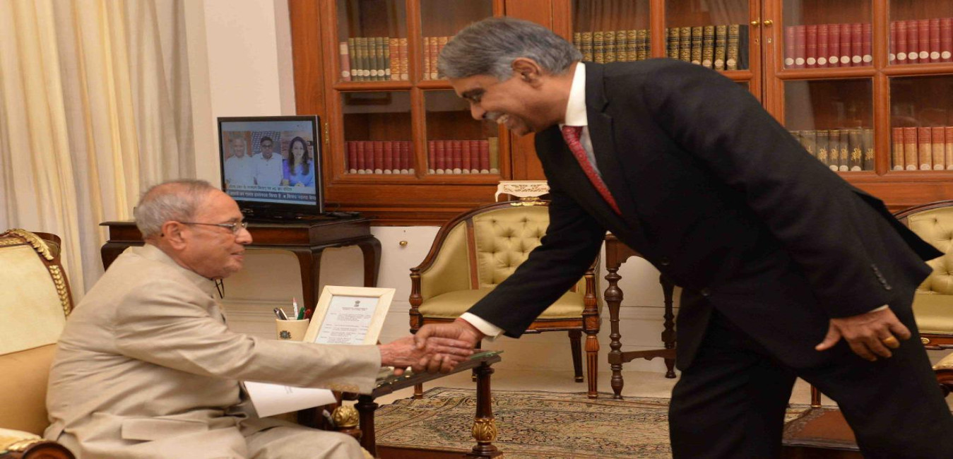 The President of India, Shri Pranab Mukherjee meeting with Shri Vishvas Sapkal, High Commissioner-designate of India to Fiji, at Rashtrapati Bhavan on April 20, 2016.
