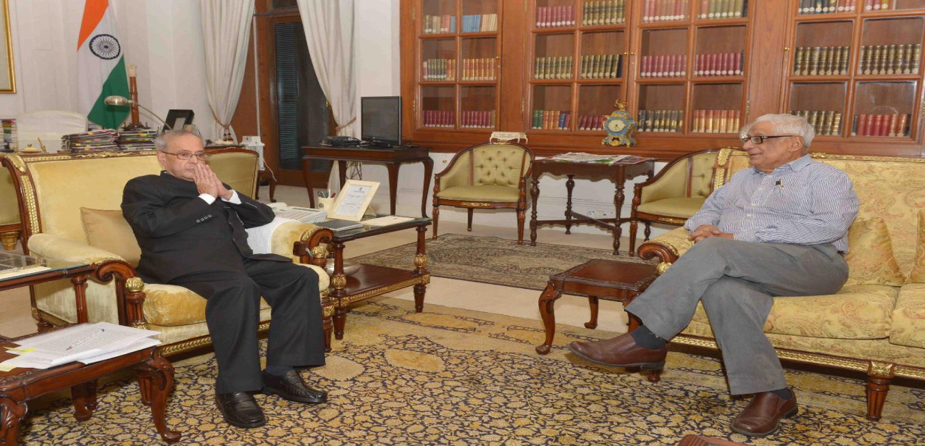 The President of India, Shri Pranab Mukherjee meeting with Shri H.K. Dua, Ex-MP (RS), at Rashtrapati Bhavan on April 19, 2016.