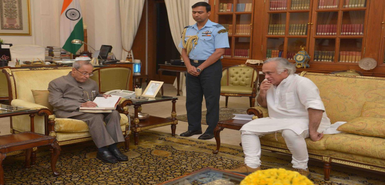 The President of India, Shri Pranab Mukherjee meeting with Shri Jairam Ramesh, MP (RS), at Rashtrapati Bhavan on March 25, 2016.