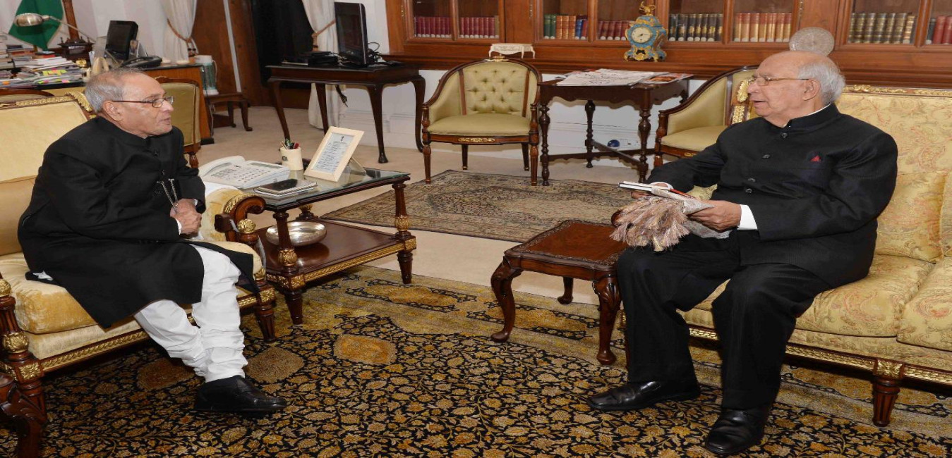 The President of India, Shri Pranab Mukherjee meeting with Shri Hansraj Bhardwaj, former Governor of Karnataka, at Rashtrapati Bhavan on February 10, 2016.