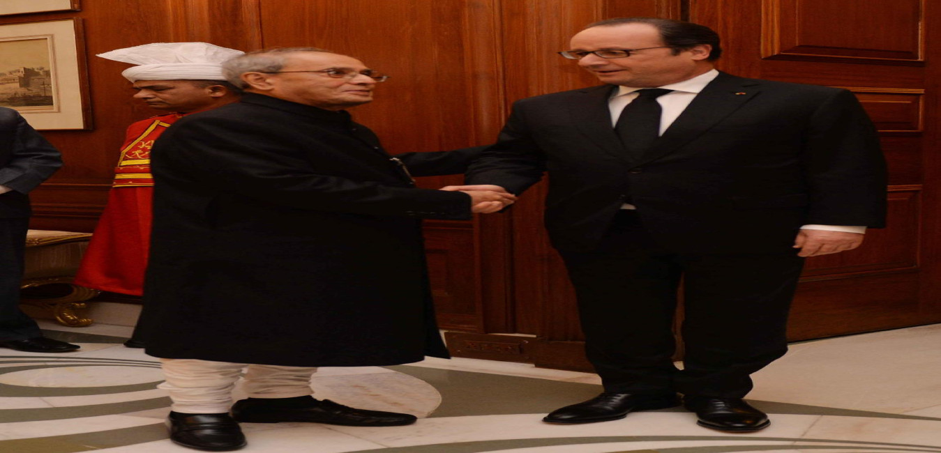 The President of the French Republic, H.E. Mr. Francois Hollande calling on the President of India, Shri Pranab Mukherjee at Rashtrapati Bhavan on January 25, 2016.