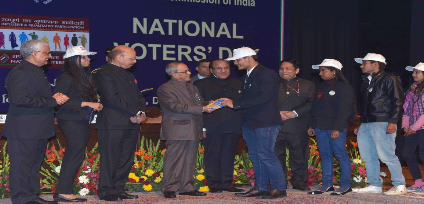 The President of India, Shri Pranab Mukherjee presenting National Awards for the Best Electoral Practices and Election Photo Identify Cards [EPICs] to newly registered young voters, at the 6th National Voters' Day Celebrations organized by the Election Commission of India, in New Delhi on January 25, 2016.
