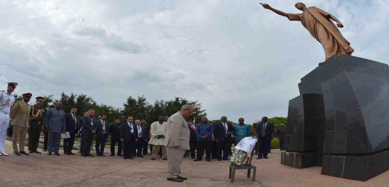 The President of India, Shri Pranab Mukherjee laying wreath at the statue of Dr. Kwame Nkrumah, the first President of the Republic of Ghana, during his visit at Kwame Nkrumah Mausoleum, in Accra, Ghana on June 13, 2016.