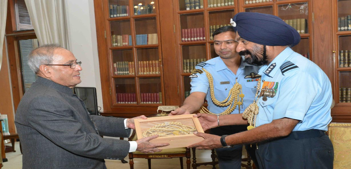 The President of India, Shri Pranab Mukherjee meeting with Air Marshal Jagjeet Singh, AOC-in-C, MC (Nagpur) & Hony ADC to the President, at Rashtrapati Bhavan on November 20, 2015.