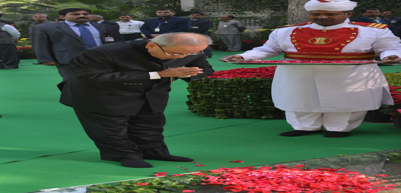 The President of India, Shri Pranab Mukherjee paying floral tributes at the samadhi of the former Prime Minister of India, Late Smt. Indira Gandhi to Commemorate her 98th Birth Anniversary, at Shakti Sthal in Delhi on November 19, 2015.