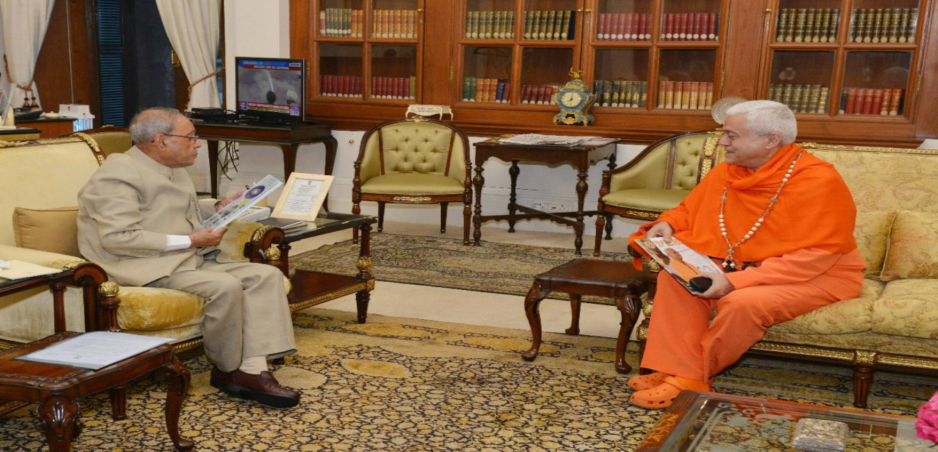 The President of India, Shri Pranab Mukherjee meeting with HH Jagatguru Amrta Suryananda Maharaja, President, European Yoga Confederation, at Rashtrapati Bhavan on May 10, 2016.