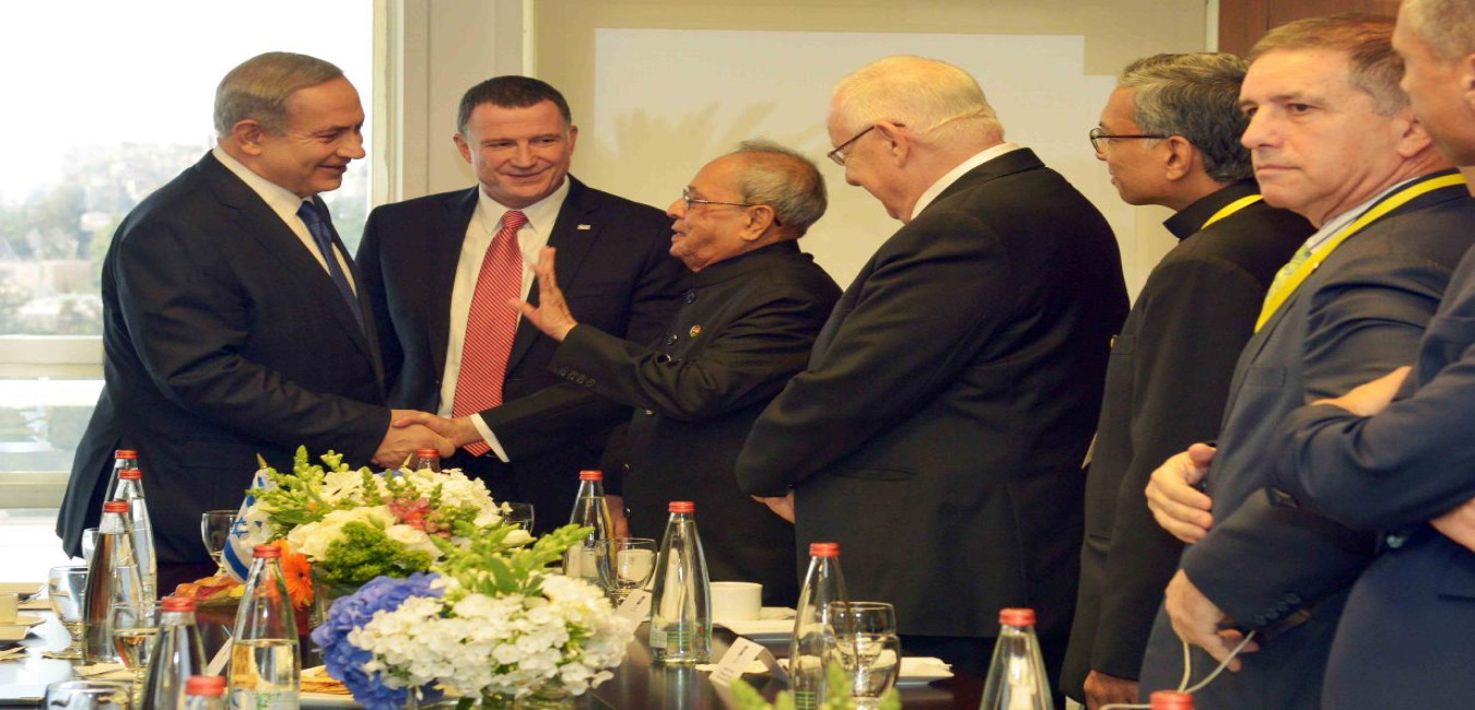 The President of India, Shri Pranab Mukherjee with the President of Israel, Mr. Reuven Rivlin, the Prime Minister of Israel, Mr. Benjamin Netanyahu, the Speaker of Knesset, Mr. Yuli-Yoel Edelstein and the Leader of Opposition, Mr. Issac Herzog, during a meeting, at Knesset, Jerusalem, in Israel on October 14, 2015.