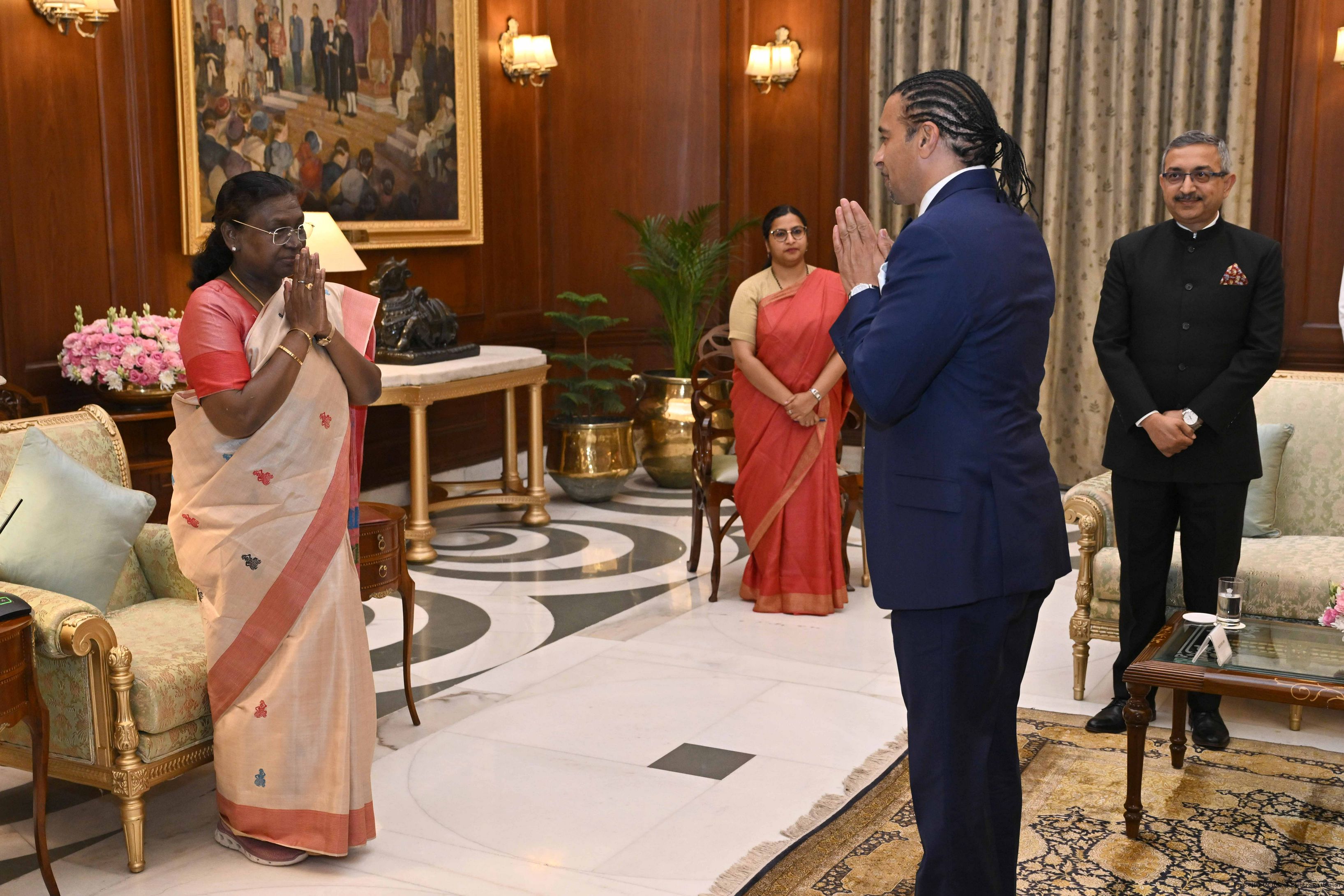 The High Commissioner-designate of Saint Kitts and Nevis, H.E. Mr. Gurdip Bath presenting his credentials to the President of India, Smt Droupadi Murmu at Ashok Hall of Rashtrapati Bhavan in New Delhi on May 29, 2025.