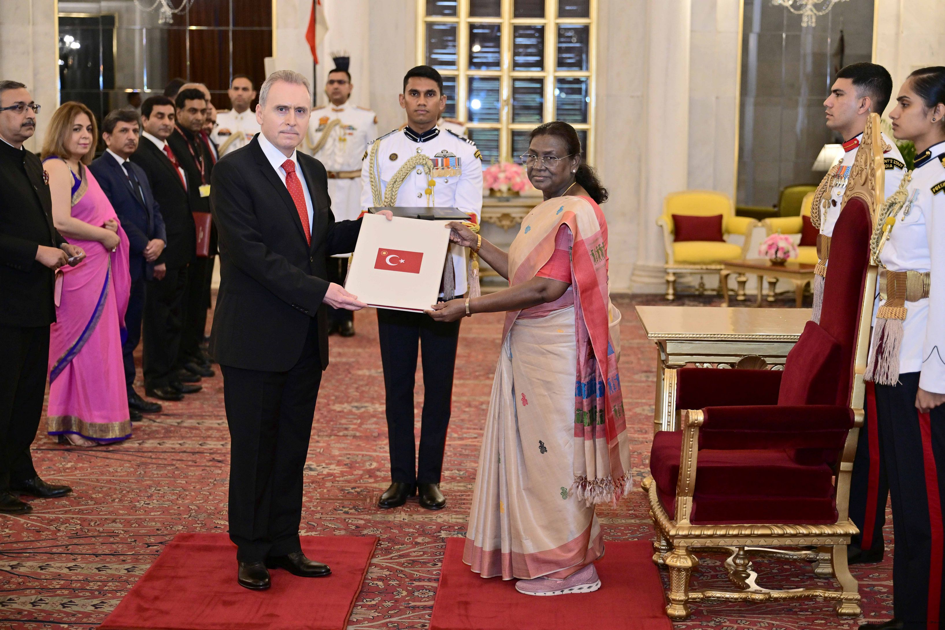 The Ambassador-designate of the Republic of Turkiye, H.E. Mr. Ali Murat Ersoy presenting his credentials to the President of India, Smt Droupadi Murmu at Ashok Hall of Rashtrapati Bhavan in New Delhi on May 29, 2025.