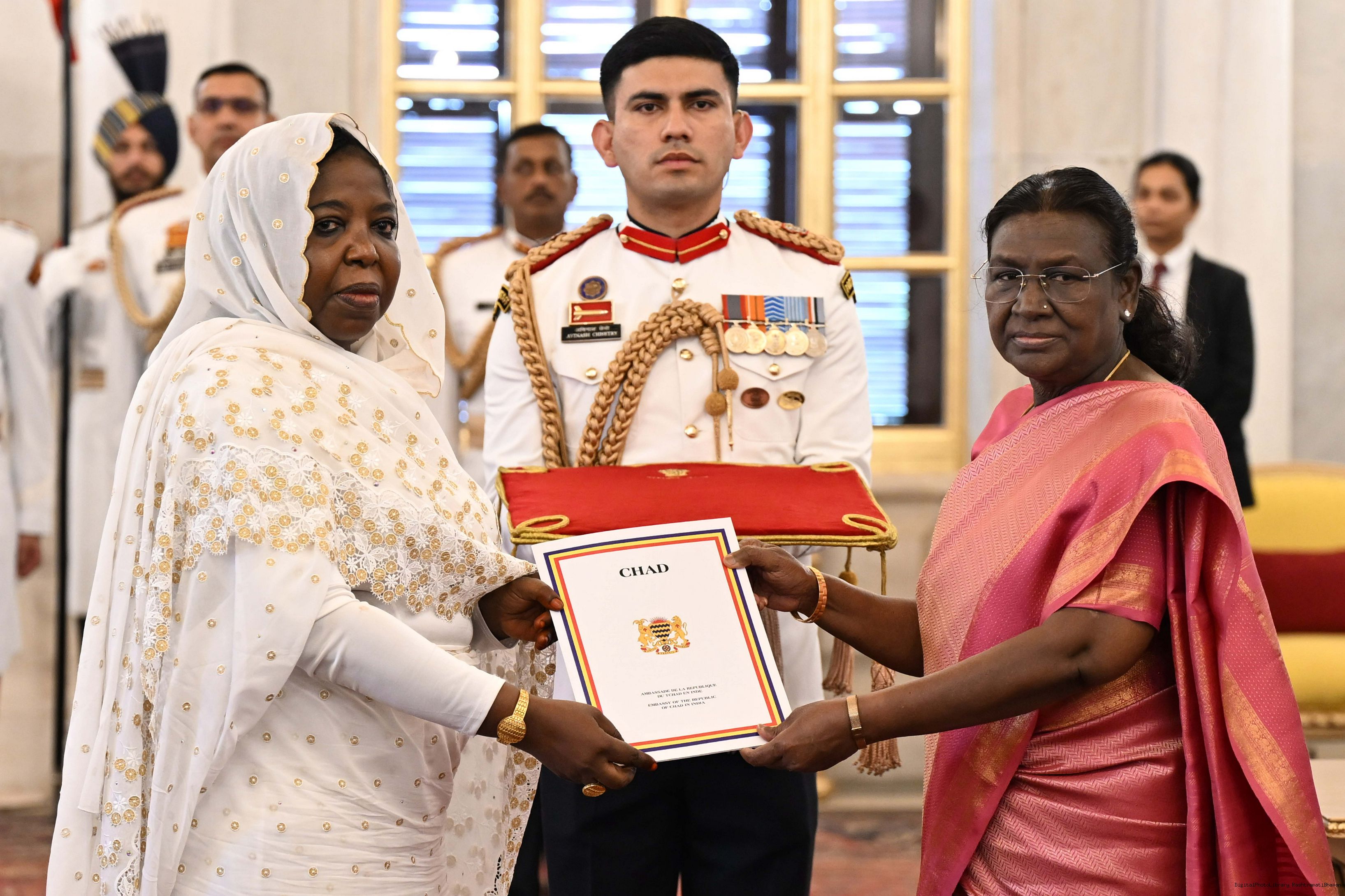 H.E. Mrs Ildjima Badda Mallot, Ambassador of the Republic of Chad presenting credentials to the President of India, Smt Droupadi Murmu at a ceremony held at Rashtrapati Bhavan on May 30, 2025.