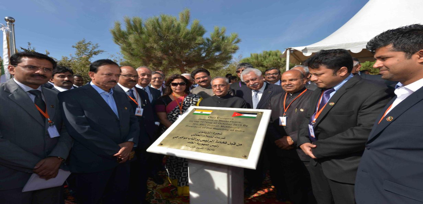 The President of India, Shri Pranab Mukherjee planting an Olive sapling, at Al-Quds University, Abu Dees, in Palestine on October 13, 2015.