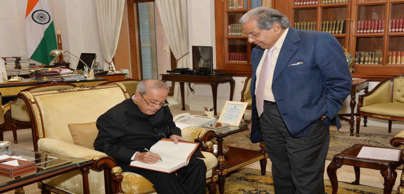 The President of India, Shri Pranab Mukherjee meeting with Shri S.K. Birla, at Rashtrapati Bhavan on February 19, 2016.