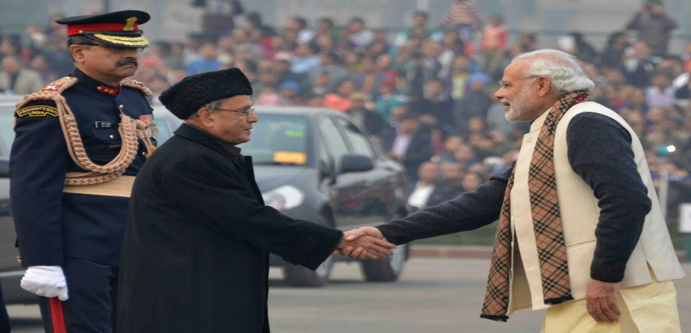 The President of India, Shri Pranab Mukherjee being received by the Prime Minister of India, Shri Narendra Modi, on his arrival at Vijay Chowk to witness the 'Beating Retreat', in New Delhi on January 29, 2016.