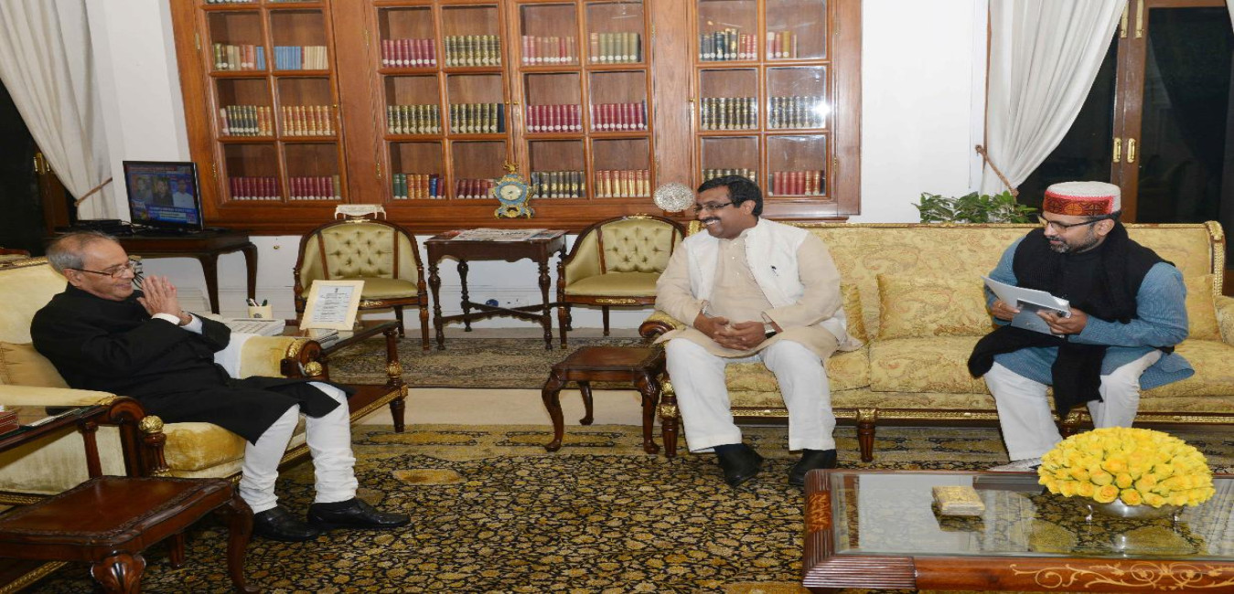 The President of India, Shri Pranab Mukherjee meeting with Shri Suresh Pachauri, former Union Minister, at Rashtrapati Bhavan on January 28, 2016.
