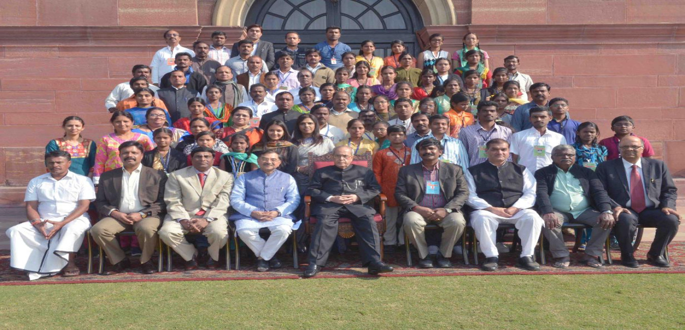 The President of India, Shri Pranab Mukherjee with the winners of the Thirukural Competition, at Rashtrapati Bhavan on December 16, 2015.
