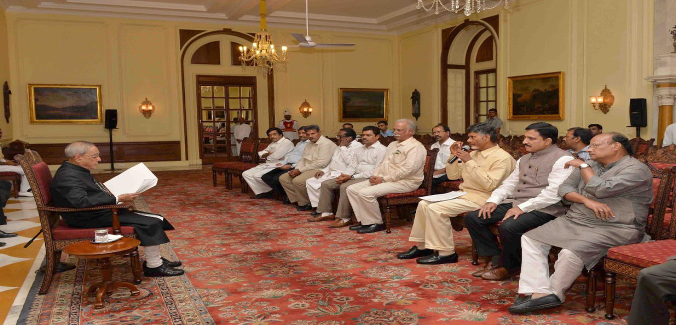 The Chief Minister of Andhra Pradesh, Shri Nara Chandrababu Naidu alongwith a delegation of Ministers, Telegu Desam Party's MPs and Officials meeting the President of India, Shri Pranab Mukherjee, at Rashtrapati Bhavan, in New Delhi on June 10, 2015.