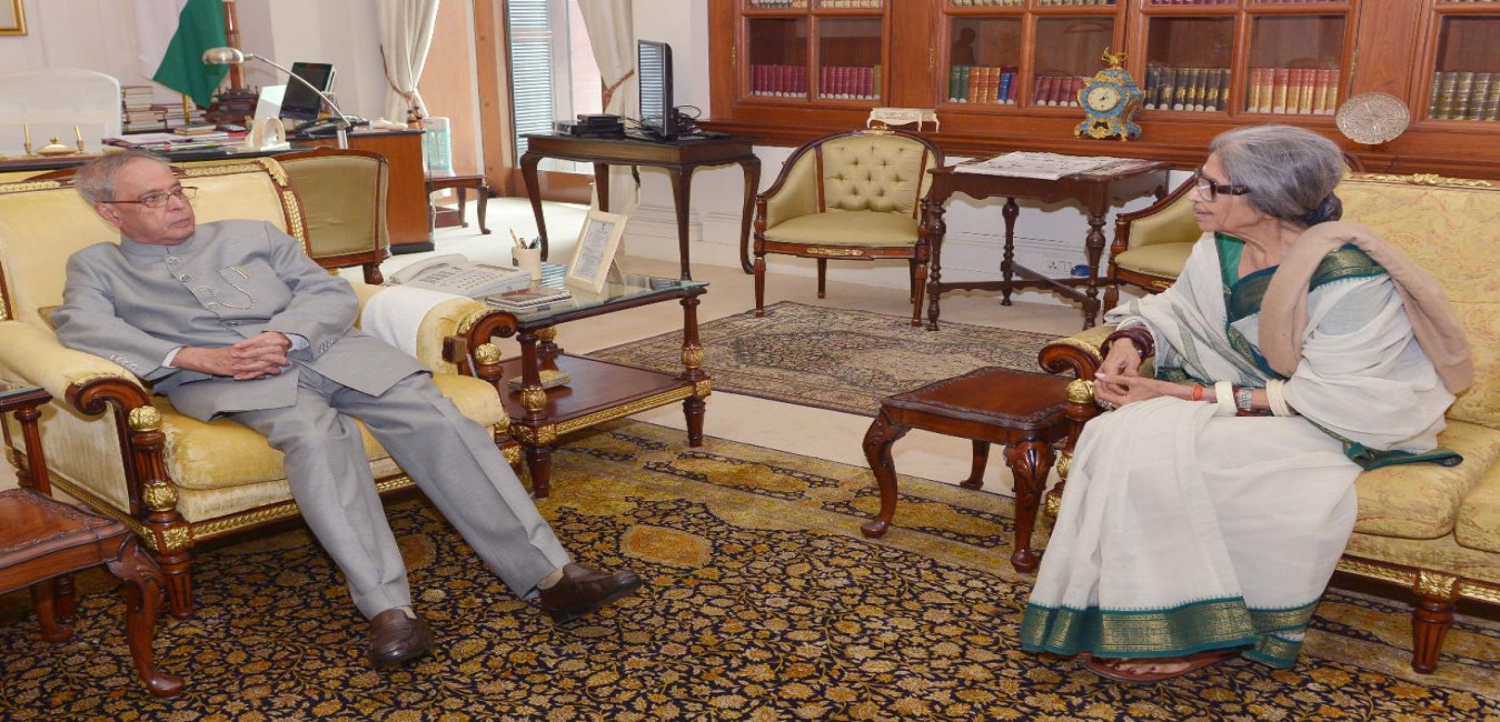 The President of India, Shri Pranab Mukherjee meeting with the Chairperson, Kasturba Gandhi National Memorial Trust, Smt. Tara Gandhi Bhattacharjee, at Rashtrapati Bhavan, in New Delhi on June 08, 2015.