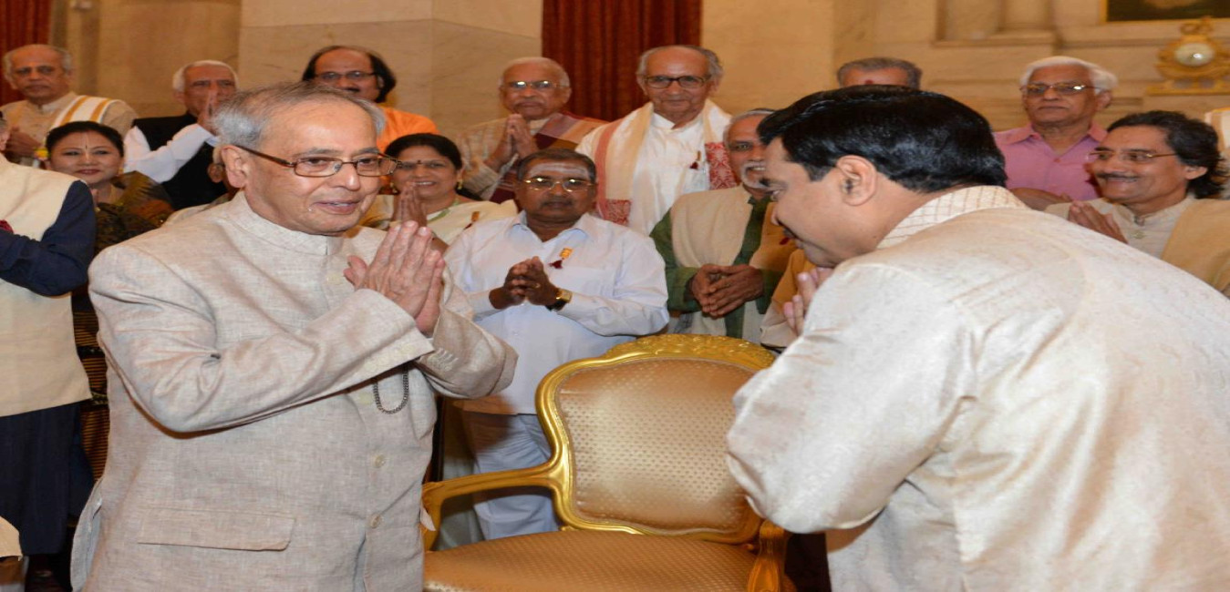 The President of India, Shri Pranab Mukherjee presenting Sangeet Natak Akademi Fellowships Awards for the year 2014, at Rashtrapati Bhavan on October 23, 2015.