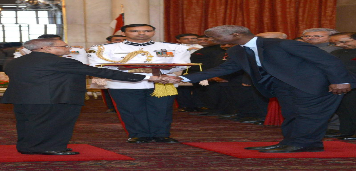The Ambassador designate of the Republic of the Marshall Islands, HE Mr Thomas D Kijiner presenting his credentials to the President of India, Shri Pranab Mukherjee, at Rashtrapati Bhavan, in New Delhi on March 18, 2015.