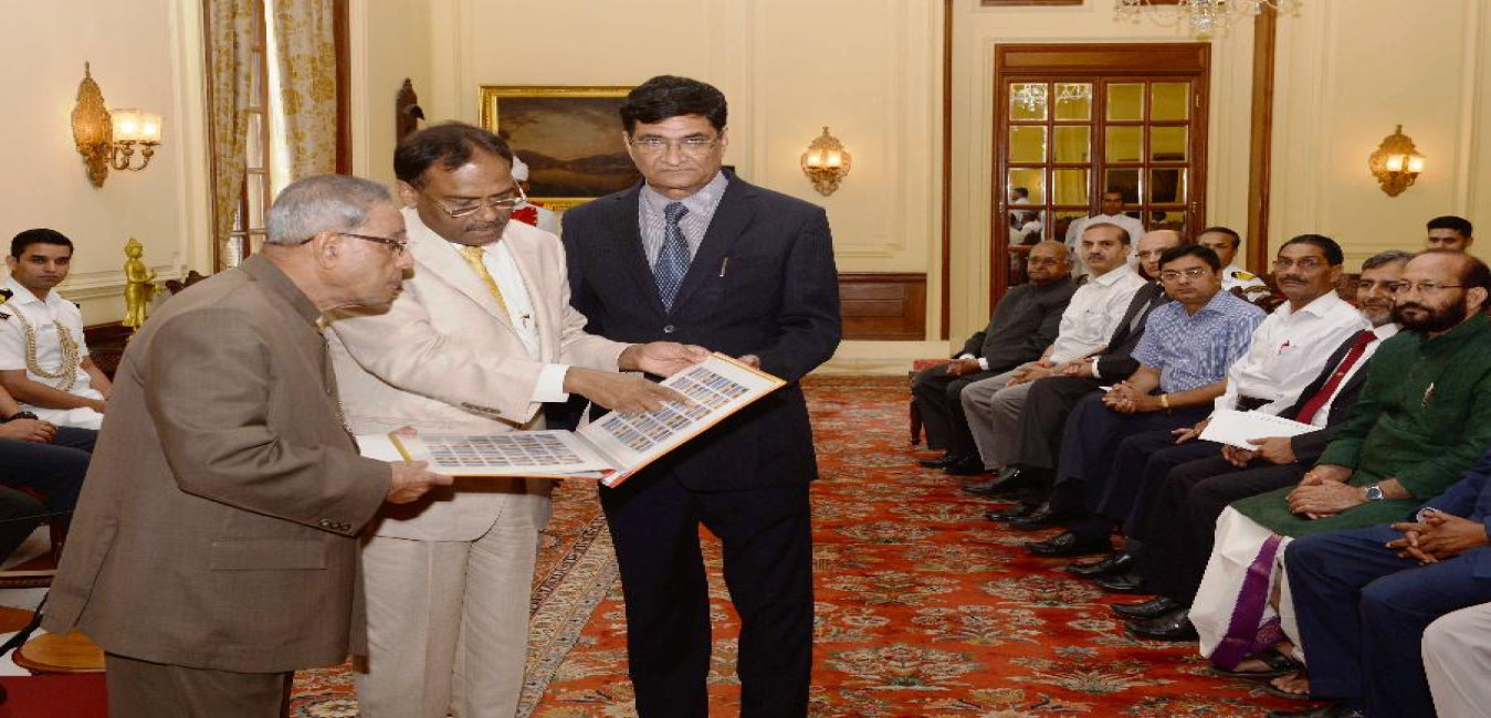 The President of India, Shri Pranab Mukherjee administering the oath of office to Shri Justice Handyala Lakshminarayanaswamy Dattu as the Chief Justice of the Supreme Court of India at the swearing in ceremony at Rashtrapati Bhavan in New Delhi on Sep 28, 2014
