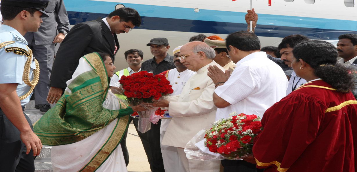 The President of India, Smt Pratibha Devisingh Patil being welcomed by the Governor of Karnataka, Shri Hansraj Bhardwaj and Chief Minister of Karnataka Shri D V Sadananda Gowda at Bangalore Airport in Karnataka on Aug 05, 2011