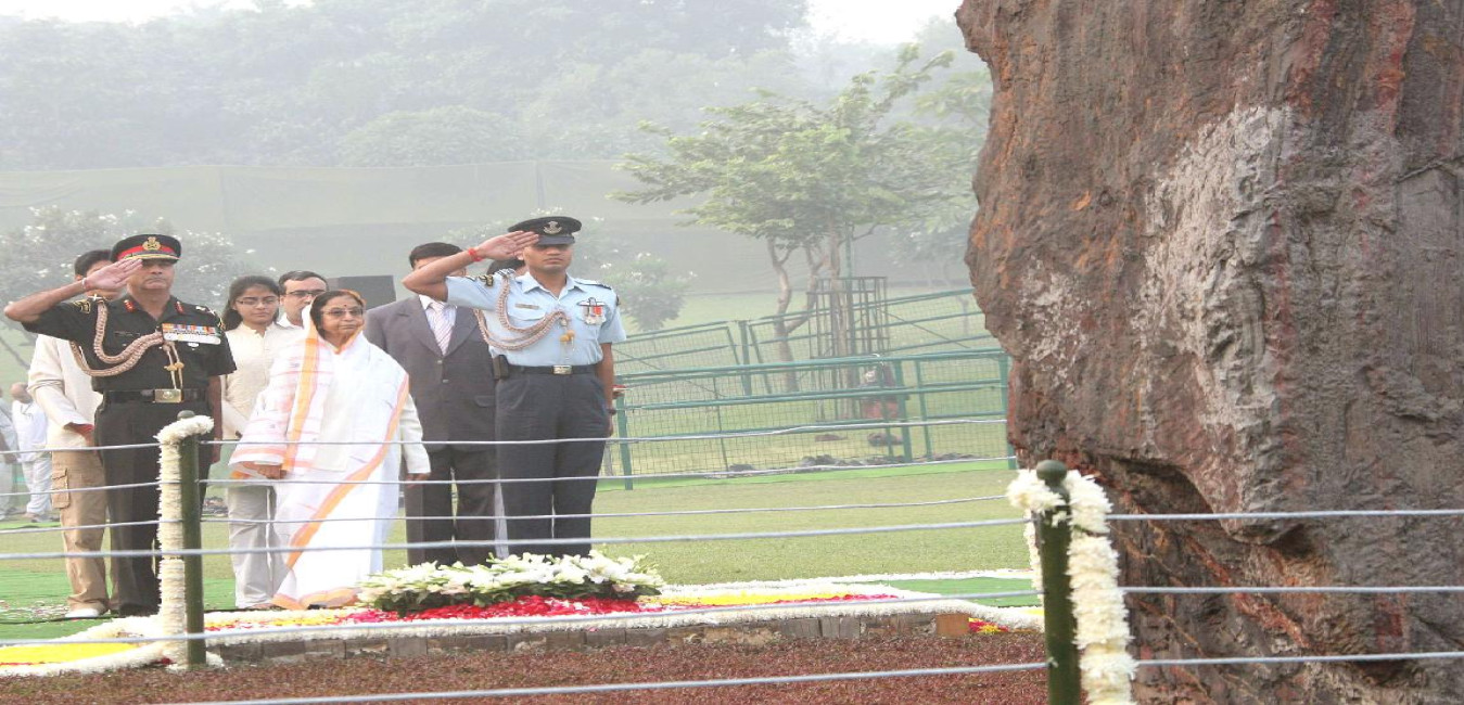 The President of India, Smt Pratibha Devisingh Patil paying homage at the Samadhi of the Former Prime Minister of India, Late Smt Indira Gandhi on the occasion of her 24th Death Anniversary at Shakti Sthal in New Delhi on Oct 31, 2008