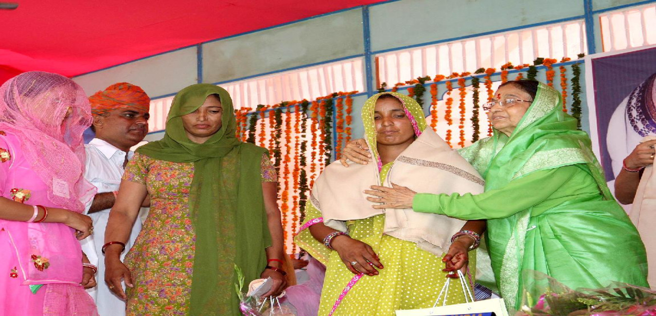 The President of India, Smt Pratibha Devisingh Patil felicitating a Group of war widows at Indrapura Village in Jhunjhunu District in Rajasthan on June 22, 2008